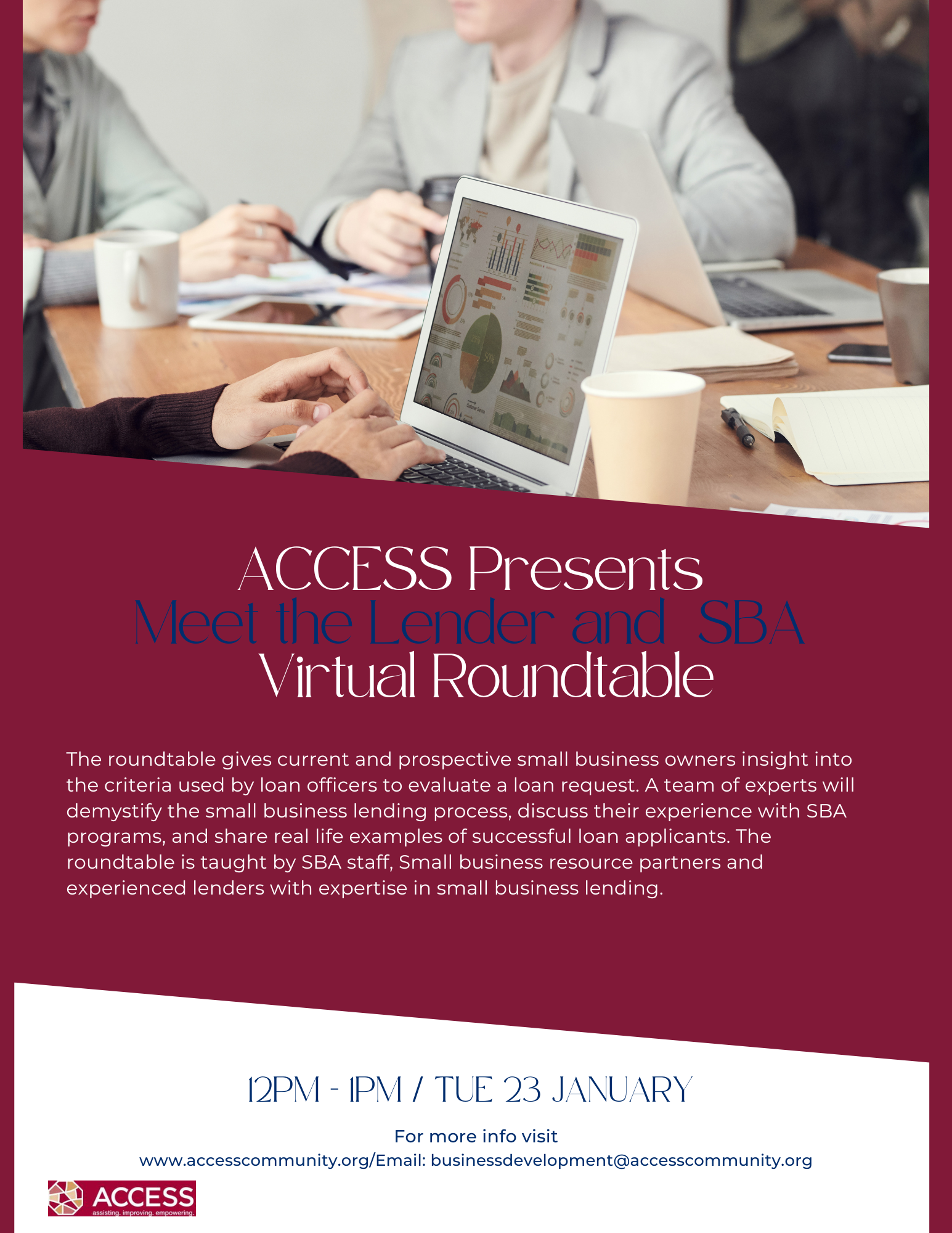 The roundtable gives current and prospective small business owners insight into the criteria used by loan officers to evaluate a loan request. A team of experts will demystify the small business lending process, discuss their experience with SBA programs, and share real life examples of successful loan applicants. The roundtable is taught by SBA Staff, Small business resource partners, and experienced lenders with expertise in small business lending.