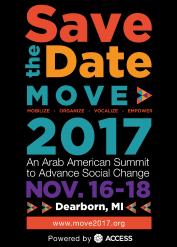 MOVE 2017 is a first-of-its-kind national gathering of Arab Americans that will convene people representing various fields, interests and perspectives to discuss the most pressing issues facing our community. Produced by ACCESS, the nation’s largest Arab American organization, and its three national institutions – the Arab American National Museum (AANM), the National Network for Arab American Communities (NNAAC) and the Center for Arab American Philanthropy (CAAP) – this two-day convening will leverage our diverse experiences and provide space for artists, activists, scholars, philanthropists, organizations and others from the Arab American community to connect, learn and exchange ideas. Merging and building on AANM’s biennial DIWAN: A Forum for the Arts, NNAAC’s Arab American Summit, and CAAP’s philanthropic leadership, MOVE 2017 will encourage attendees to explore intersectionality in a safe environment that is conducive to networking, discovery and the facilitation of critical conversations on a wide range of issues impacting our community. Join us as we work to Mobilize, Organize, Vocalize, and Empower Arab Americans.